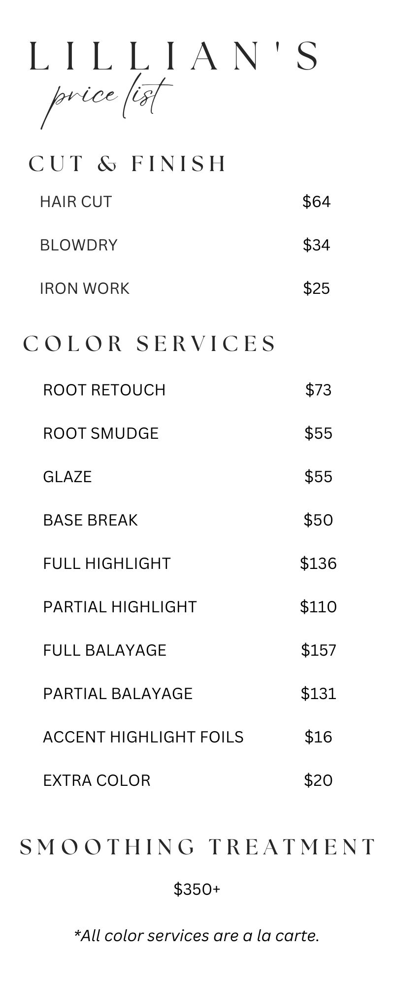 What Lillian loves most about being a hairstylist is the connection. She finds joy in helping clients step outside their comfort zone, building trust and friendships behind the chair, and empowering guests with hair knowledge they can use between appointments. For Lillian, great hair is more than a look—it is confidence, self-expression, and a relationship built over time.